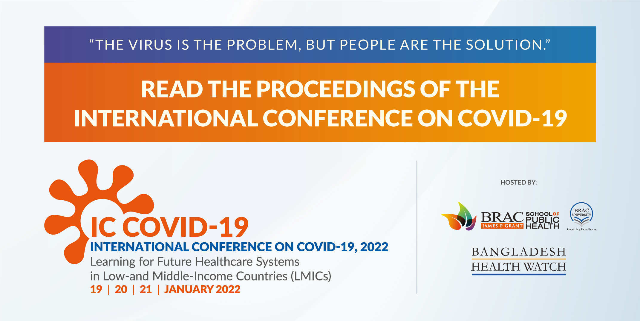 The COVID-19 catastrophe intersected across health, education, economy, social protection, gender, and governance. The patterns of transmission also threatened our sense of agency. In this situation, BRAC James P Grant School of Public Health (JPGSPH) and the Bangladesh Health Watch (BHW) are hosting an international virtual conference, to discuss, debate and document the experiences with COVID-19 pandemic including emerging variants such as the Delta variant across low-and middle-income countries (LMICs), with the core theme: Learning from the COVID-19 Pandemic for the Future Healthcare Systems in LMICs. The conference will cover: